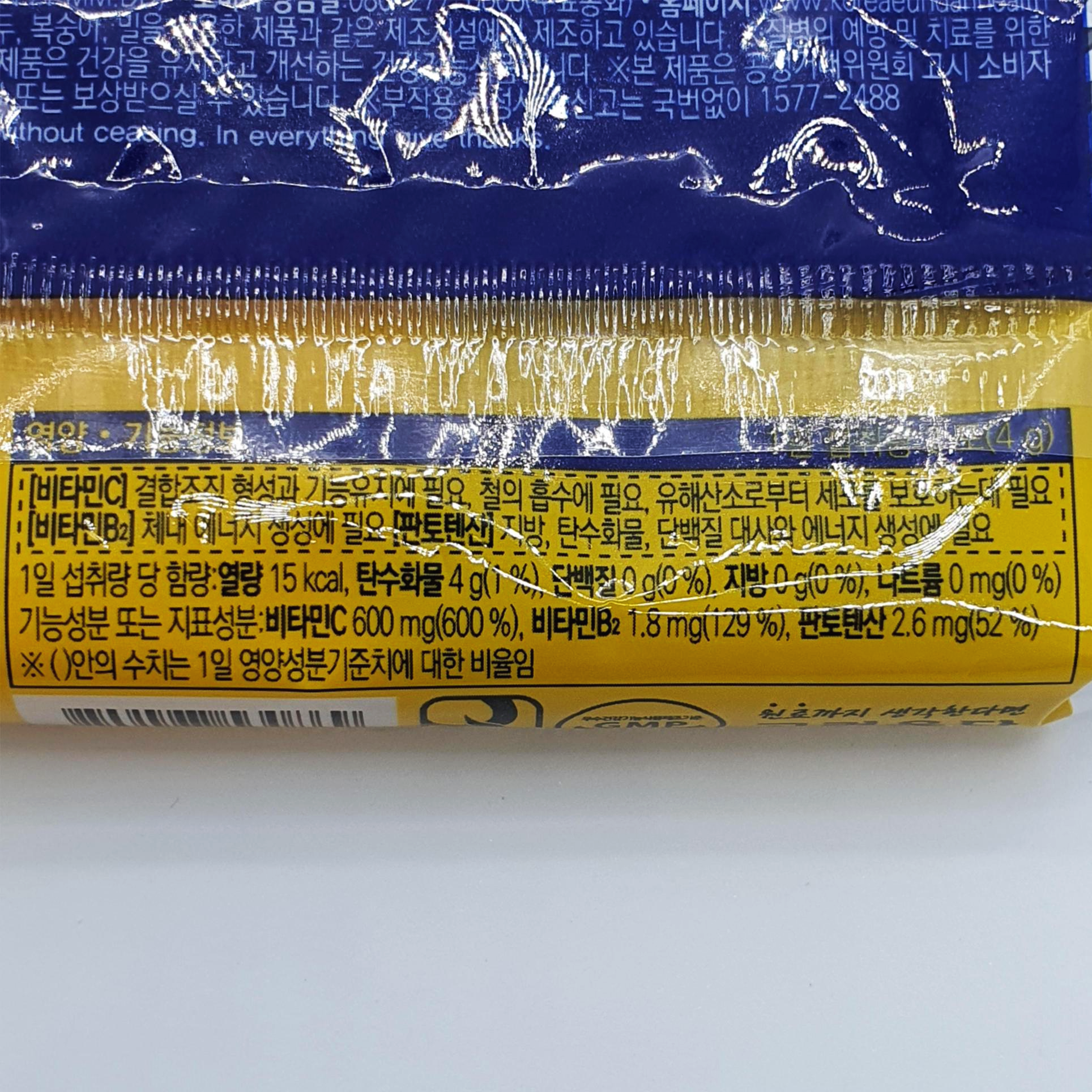1포에는 총 2g의 비타민C 혼합체제와 비타민B2, 판토텐산 이 세 주요 성분과 그 외에 다양한 성분들이 들어 있다고 하며, 레몬과즙 분말이 들어가 있다고 하네요? 흠... 괜히 맛있을 것만 같고 뭔가 익숙한 '레X나' 맛일 것만 같다는 생각이 드네요~ :)