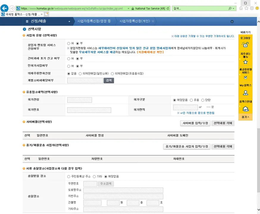 사업자 유형 선택까지 다하셨다면 선택사항 파트만 남게 되는데 해당되지 않는 경우에는 그냥 넘어가시면 됩니다.