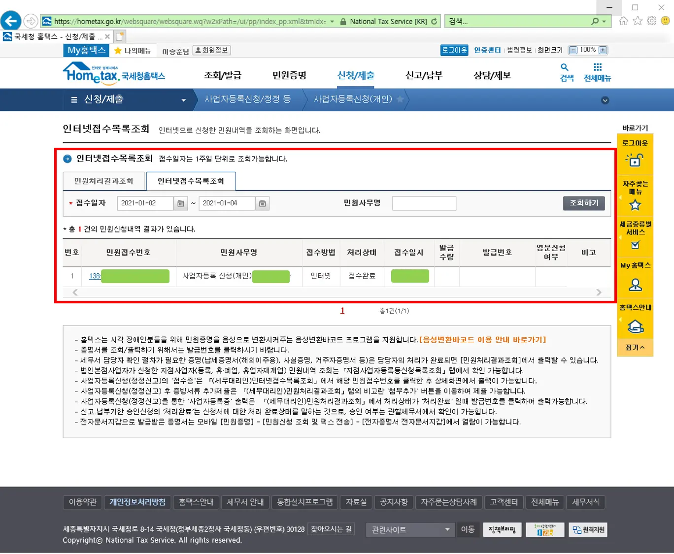 다음과 같이 '인터넷접수목록조회' 탭에서 민원접수번호 등 접수된 내용에 대한 정보를 얻으실 수 있으니 매일 확인해주시기 바랍니다.