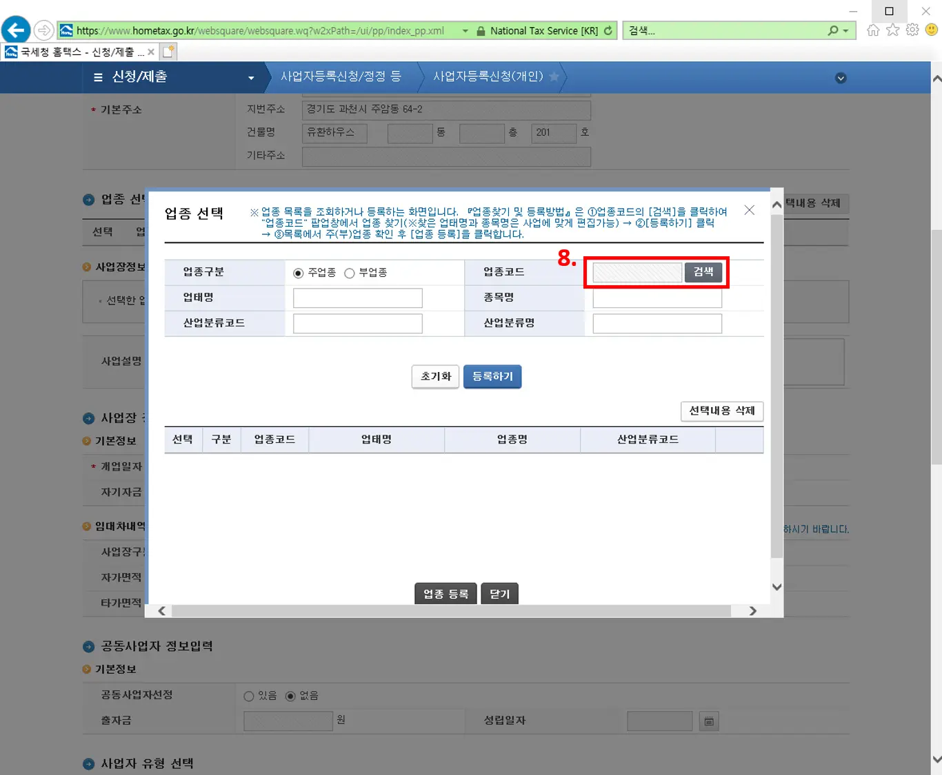 8. 그럼 위의 사진과 같이 업종 선택 창이 뜨고, 우측 '업종코드' 란에서 검색 버튼을 눌러 검색 후 중간에 보이는 푸른색 '등록하기' 버튼을 눌러 추가하신 후 최종적으로 가장 아래 보이는 '업종 등록' 버튼을 눌러 완료해주시면 됩니다.