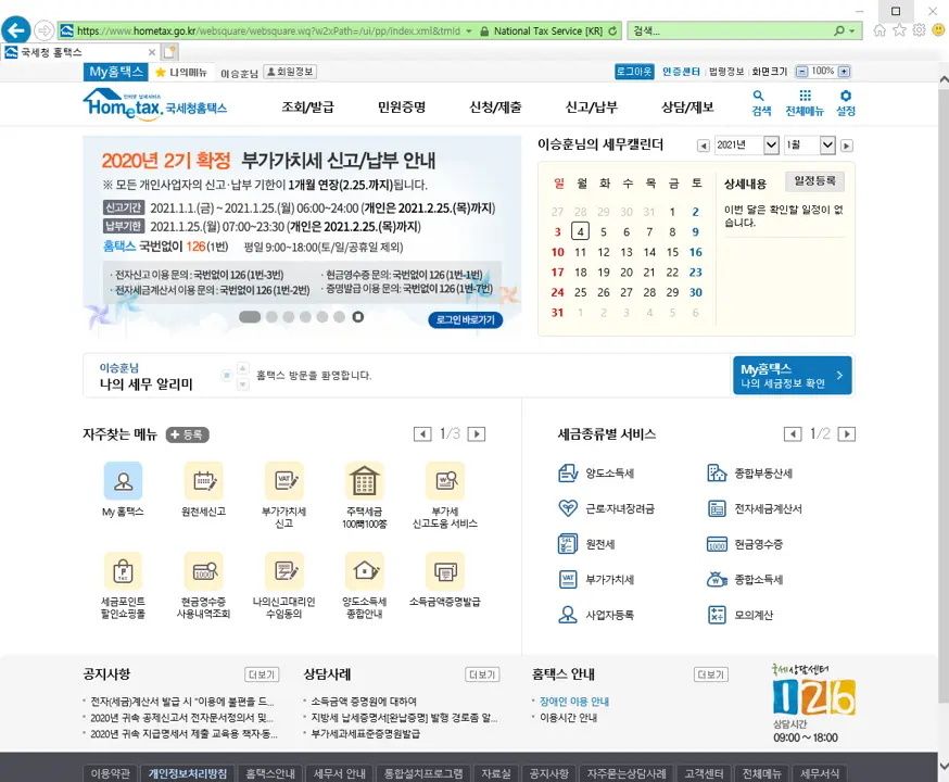 그럼, 다음과 같이 다시 국세청 홈택스 홈페이지 메인화면으로 돌아옵니다. 우측 상단에 보시면 '로그아웃'이라고 보이시죠? 로그인이 되어 있다는 증거입니다. :)