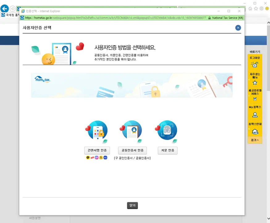 # 지문 인증의 경우에는 자신의 스마트폰에 홈택스 앱을 깔고 등록한 후 사용 가능하십니다.