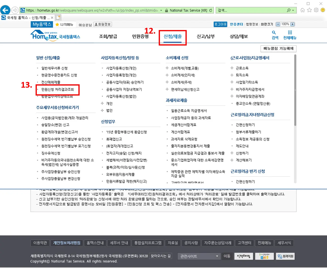 12. 접수하신 내용에 대해서는 국세청 홈택스 홈페이지 메인화면에서 '신청/제출' - 좌측'일반 신청/제출' - '민원신청 처리결과조회'에서 확인이 가능하십니다.