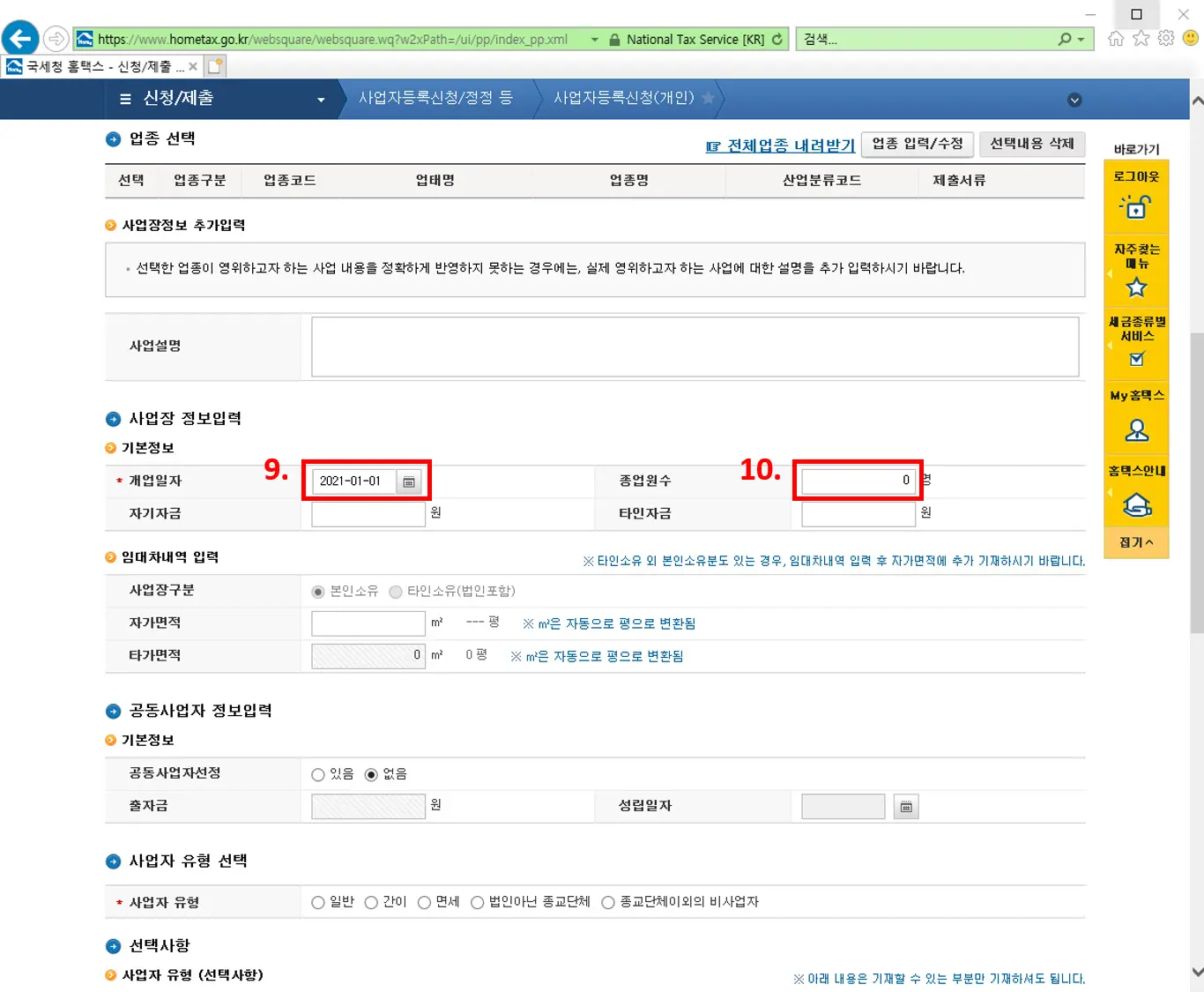 10. '종업원수'의 경우 선택사항으로 입력하는 것이라 적지 않으셔도 됩니다. 저는 그냥 별생각 없이 저 혼자 하는 거라 0명으로 적어두었습니다.