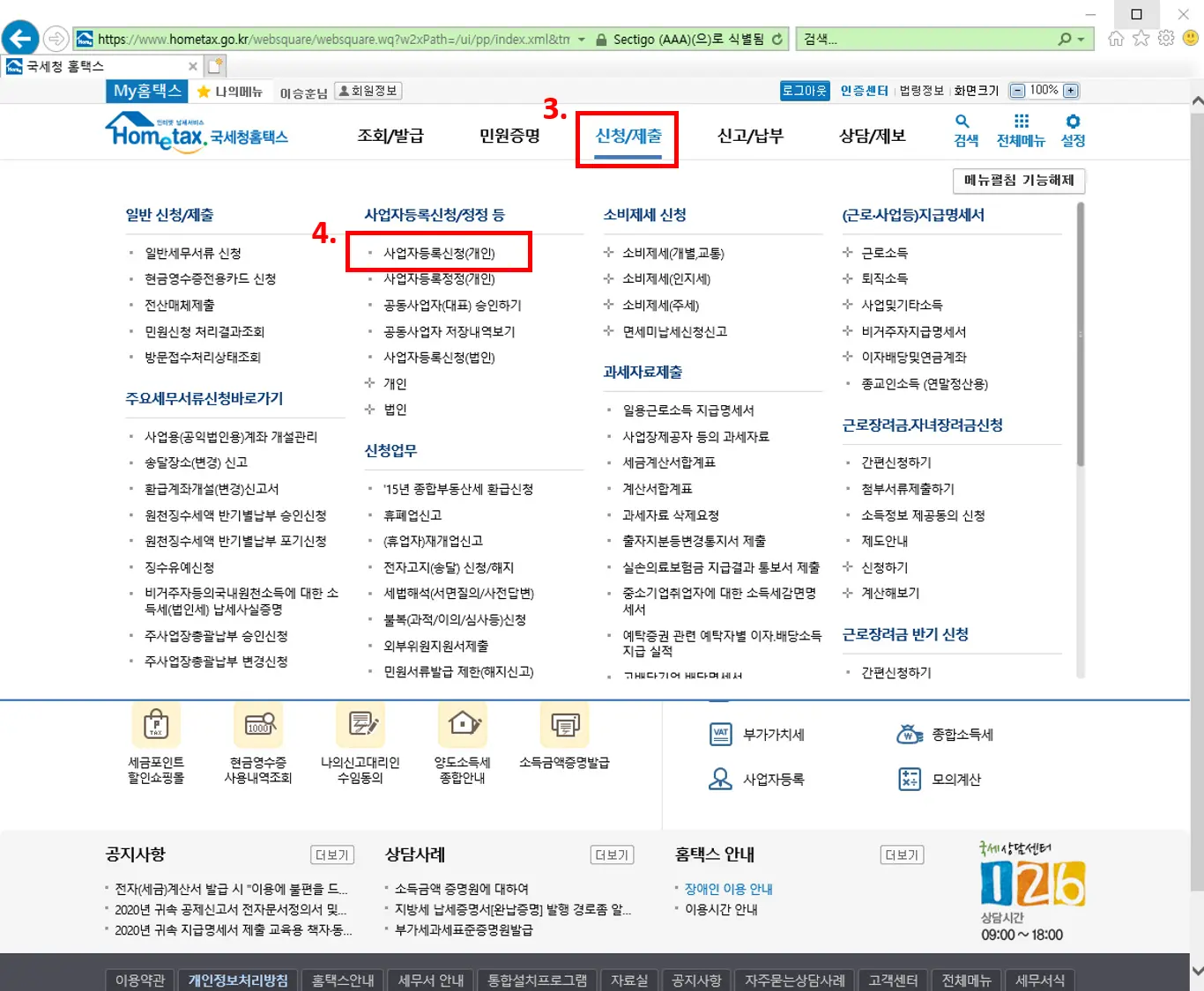 4. 그중 왼쪽으로부터 두 번째 열에 '사업자등록신청/정정 등' 섹션에서 가장 위에 위치한 '사업자등록신청(개인)'을 클릭해줍니다.