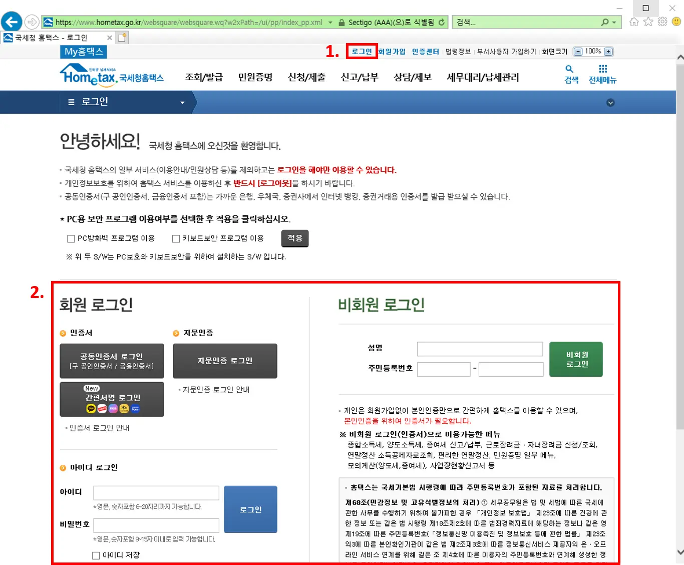 2. 하단에 '회원 로그인' 파트에서 원하는 방식으로 로그인해주세요. (저는 연말정산 등 다양한 업무를 봐야 했던 터라 이 곳에 아이디가 있어 아이디로 로그인을 하였습니다)
