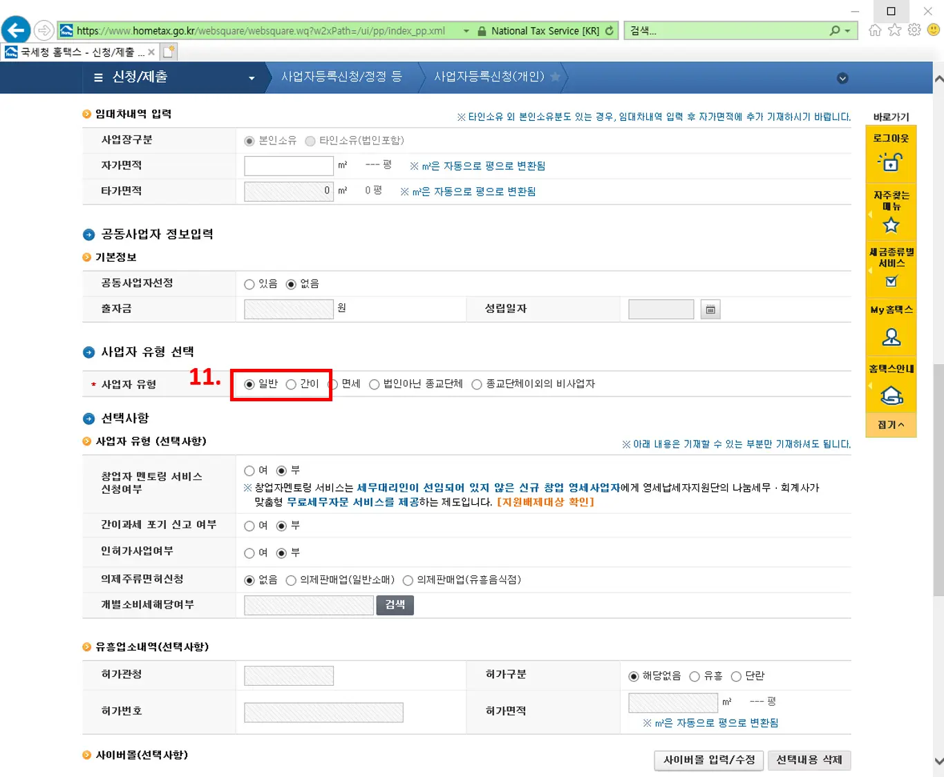 11. 다음으로는 '사업자 유형 선택' 파트입니다. 사업자 유형은 각자 원하시는 것으로 선택하시면 됩니다.