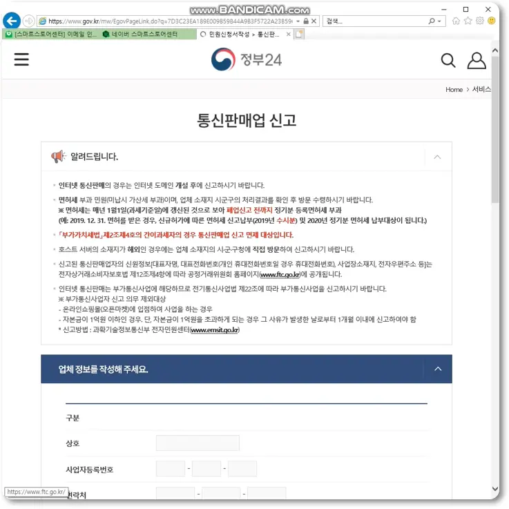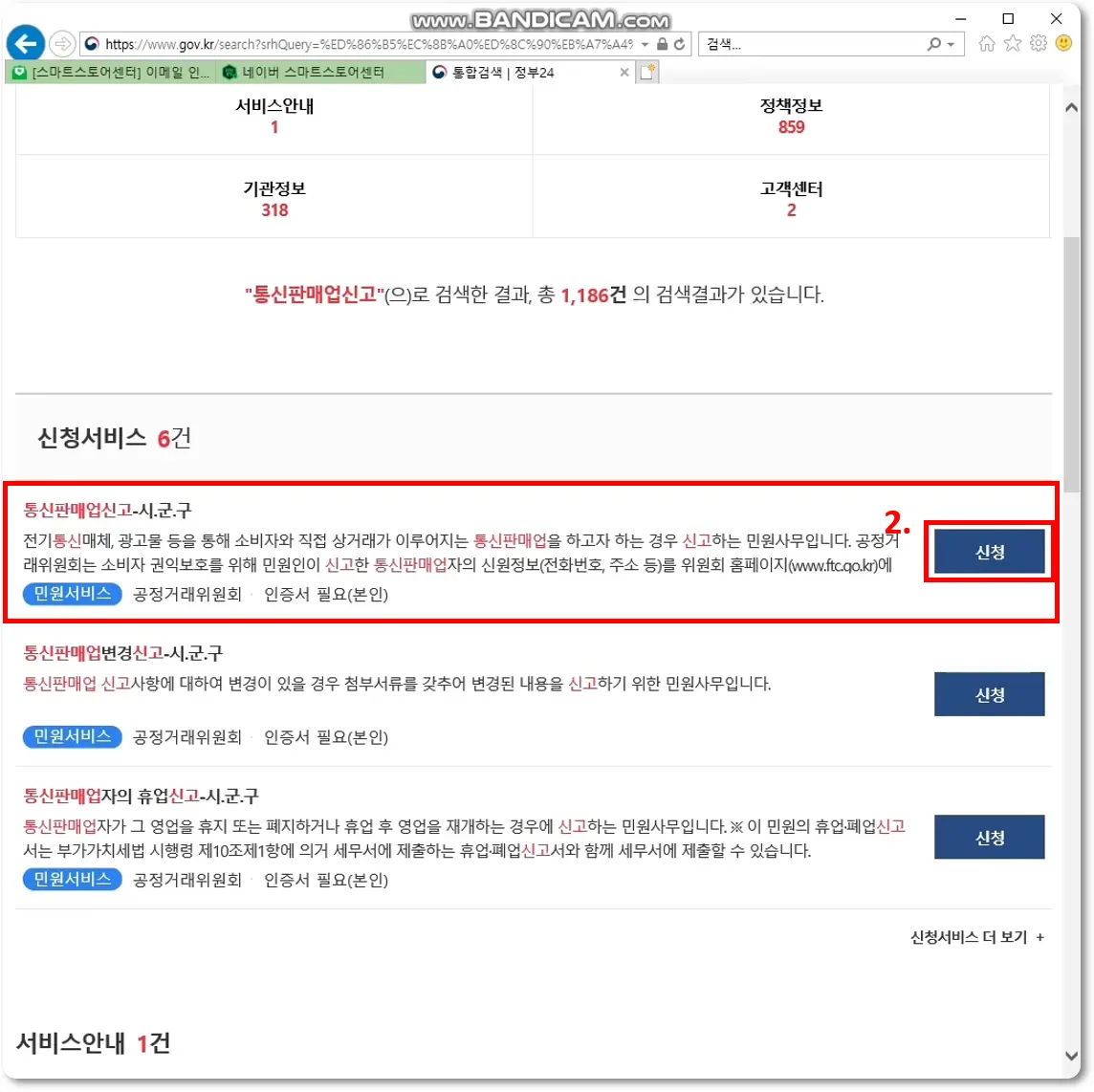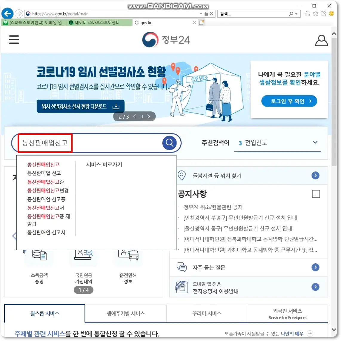 여기서, 중간보다 살짝 위에 위치한 검색창을 클릭해주신 후 '통신판매업신고'라고 입력해주신 후 엔터를 눌러주세요.
