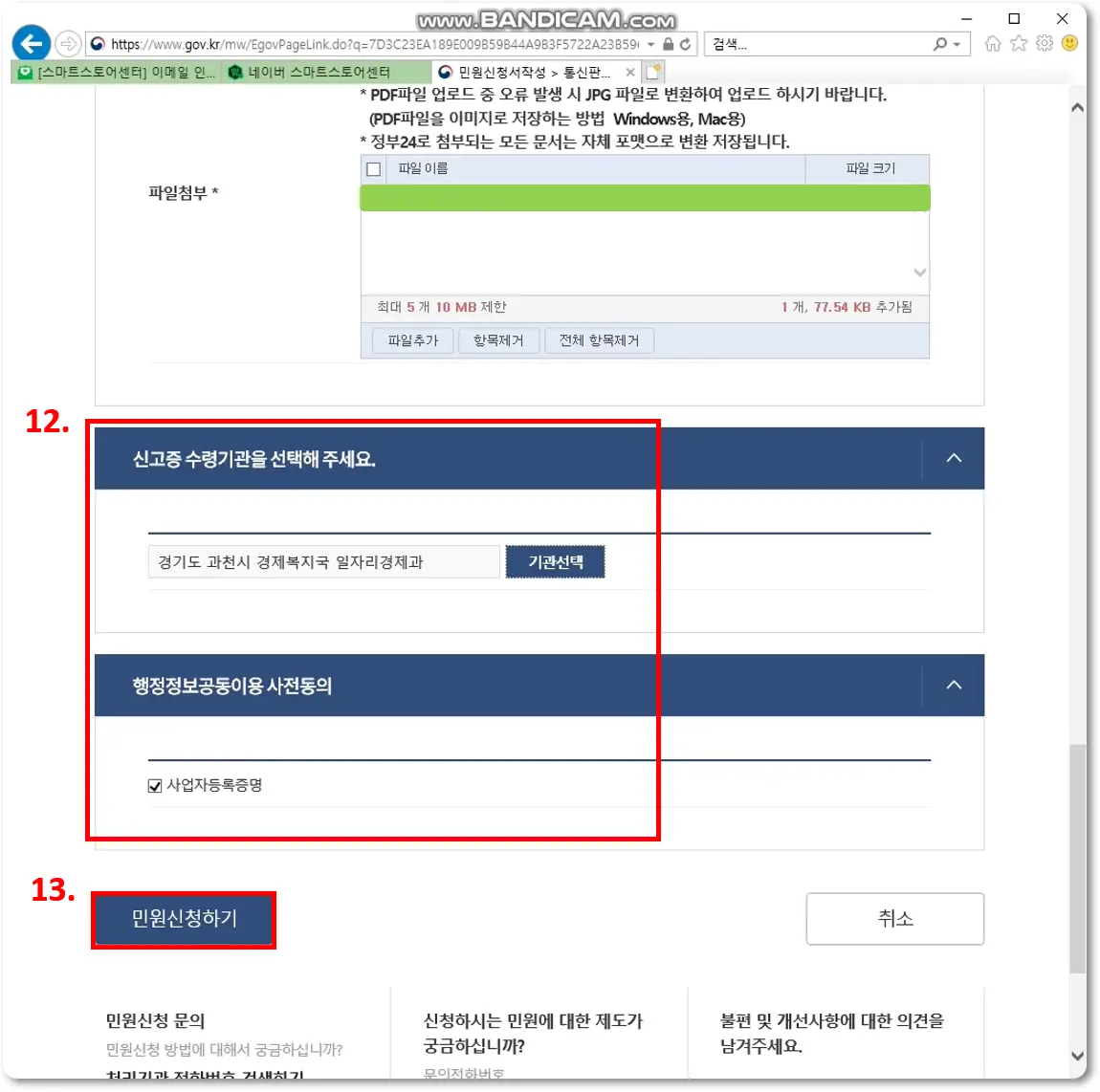 신고증 수령 기관의 경우 '기관선택'버튼을 누르면 선택지가 보이실 것이고 가까운 곳으로 선택하시면 됩니다. 그리고 행정정보공동이용 사전동의란에 사업자등록증명 앞에 체크박스에 체크해주시면 됩니다.