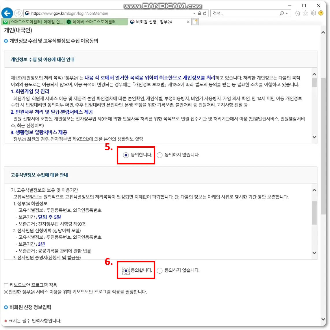'비회원 로그인'버튼을 누르면 개인정보 수집 및 고유식별정보수집 이용동의에 대해 동의 여부를 선택하는 란이 보입니다.