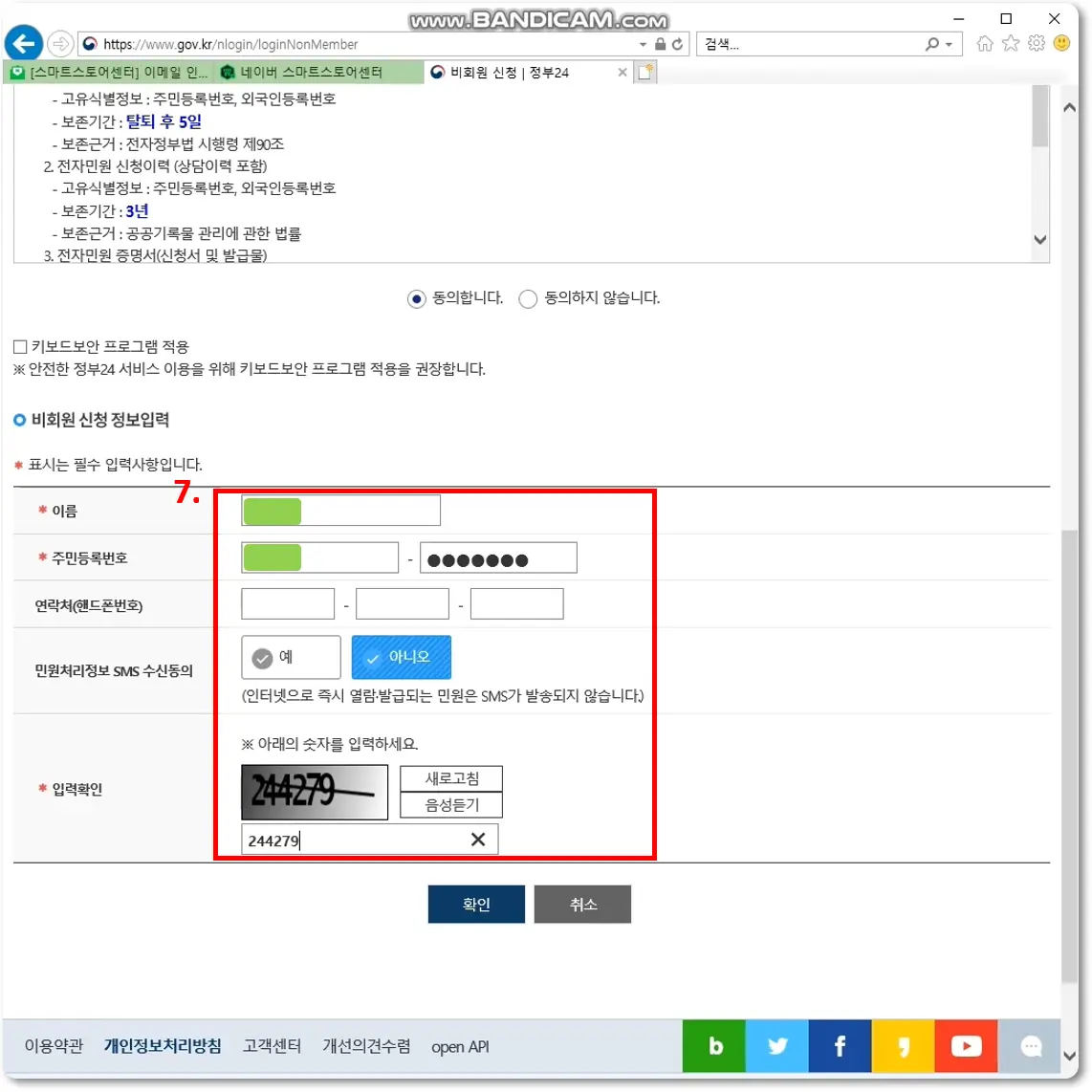 저는 필수 입력사항인 이름, 주민등록번호, 입력확인 란에만 입력하고 넘어갔습니다.