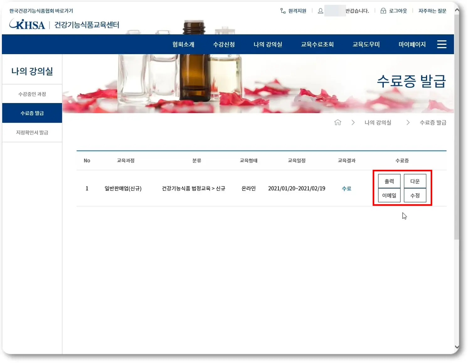 그러면 자신의 교육과정에 대한 정보와 우측 '수료증' 란에 출력, 다운, 이메일, 수정 버튼이 보이실 겁니다. 이 버튼들을 통해 수료증을 출력 및 저장 그리고 수정이 가능하시니 원하시는 작업을 하신 후 받으시면 됩니다.