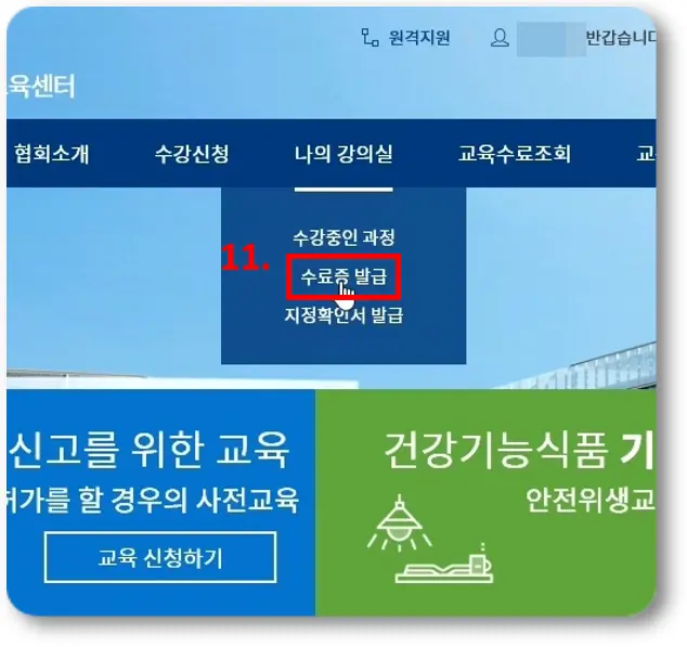 그리고, 나중에 언제든지 다시 발급받을 수 있는데요, 먼저 메인 페이지에서 상단의 '나의 강의실' 섹션에 '수료증 발급'을 클릭해줍니다.