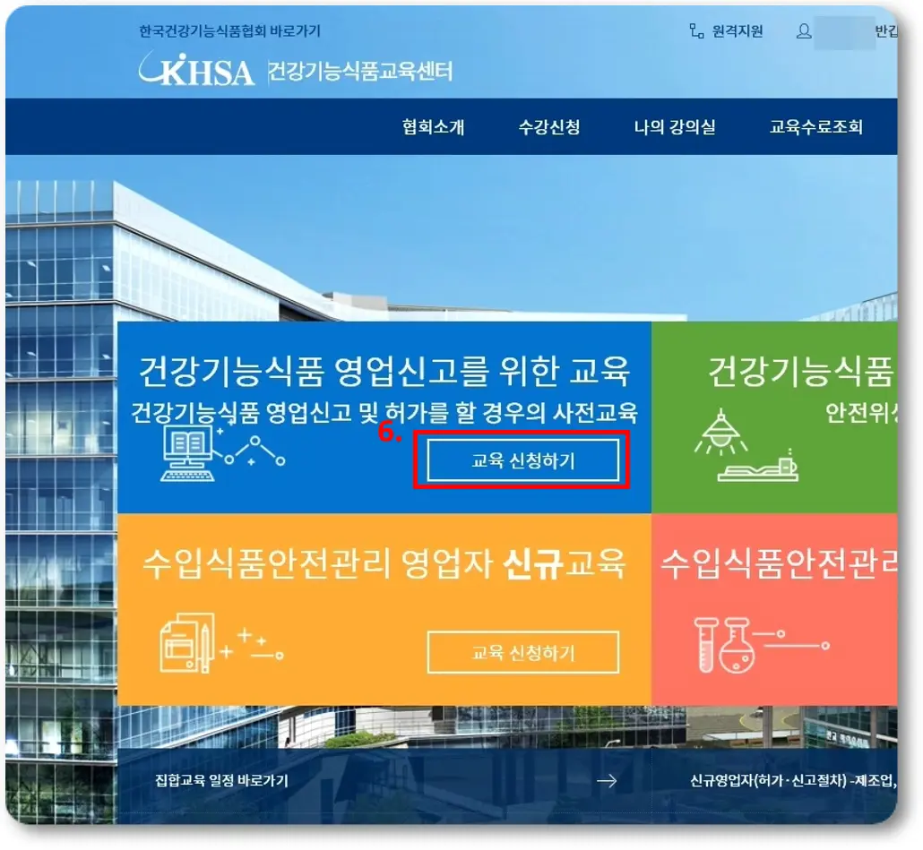 로그인 후에는 메인 화면에서 중간에 보이는 '건강기능식품 영업신고를 위한 교육'란에 보이는 '교육 신청하기'를 클릭해줍니다.