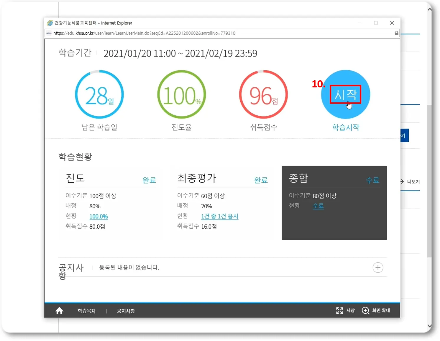 저는 수료를 한 시점에 확인해보니 학습일이 28일 남았고, 진도 100% 다 나갔으며, 취득점수는 96점이네요?