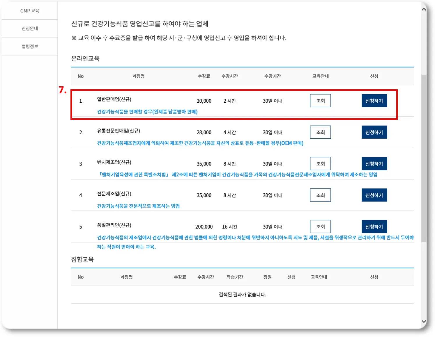 그러면, 온라인 교육 리스트가 보이게 됩니다. 저는 당장은 완제품을 납품받아 판매할 계획을 가지고 있어 '일반판매업(신규)' 교육을 신청하였습니다.