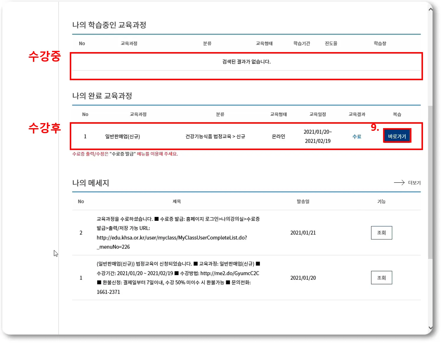 제 경우는 이미 교육을 다 받고 수료까지 전부 한 상태라 '나의 완료 교육과정'으로 옮겨져 있군요. (っ °Д °;)っ