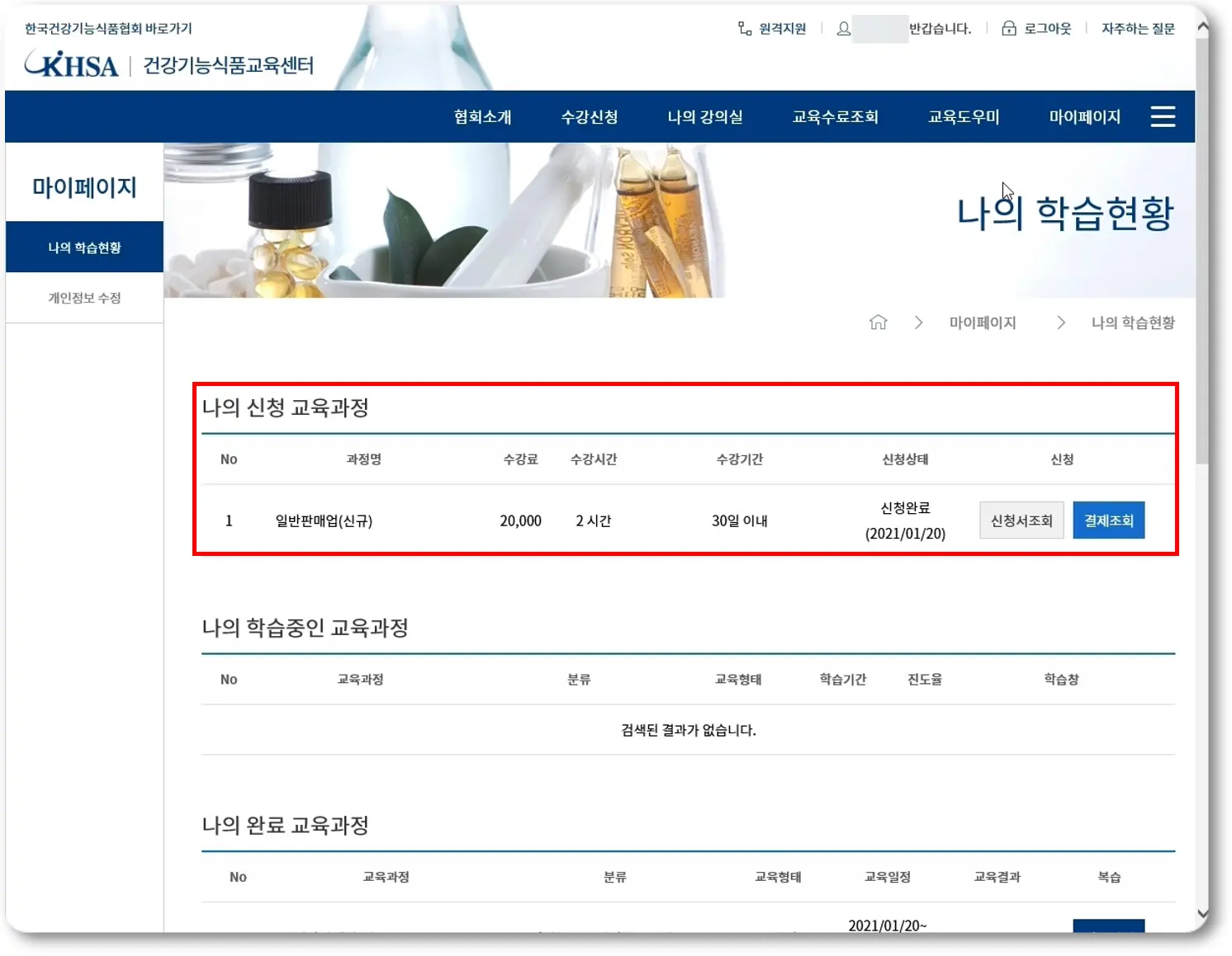 '나의 학습현황'으로 가면 제가 방금 전에 신청한 교육과정에 대한 정보를 보실 수 있으십니다.