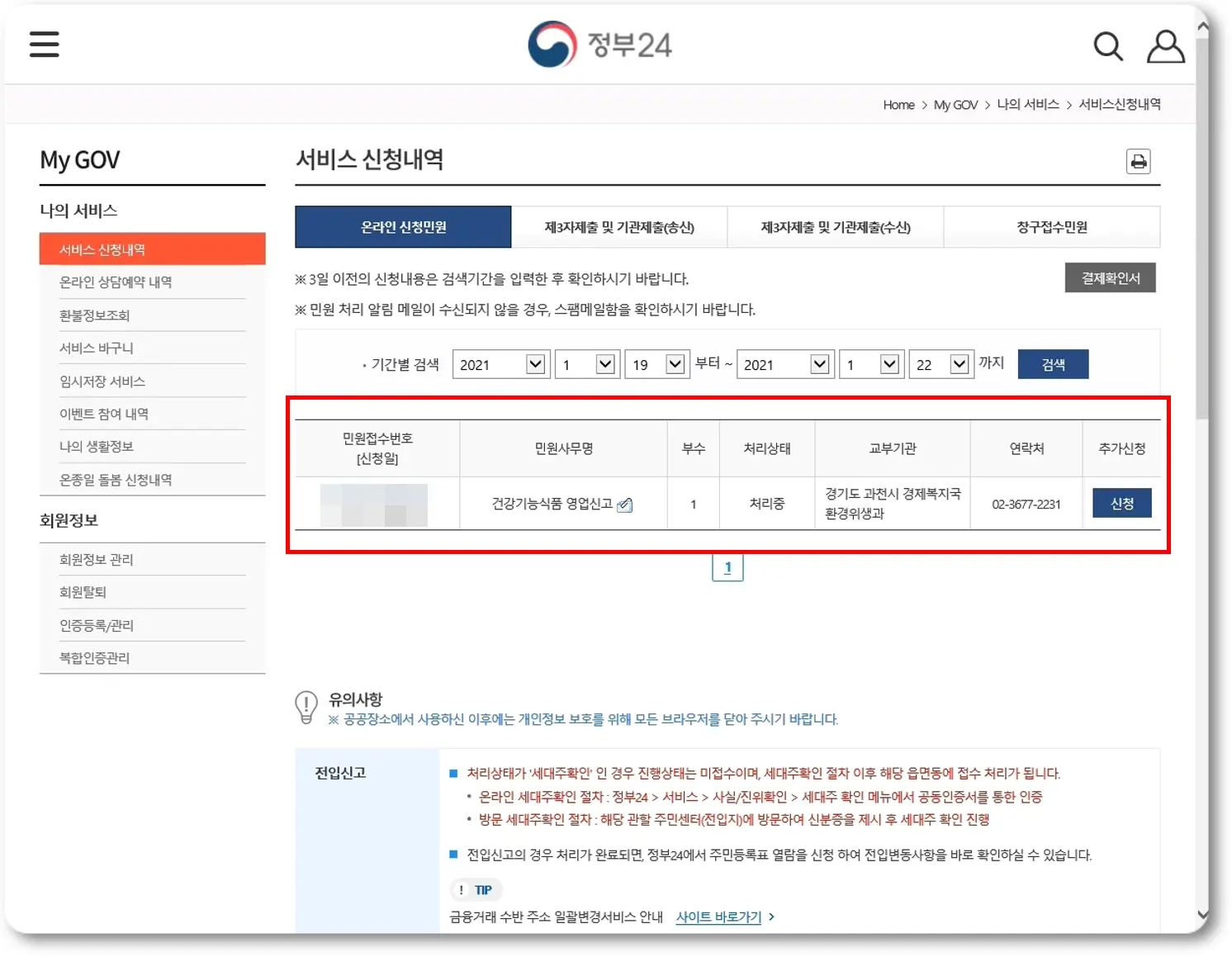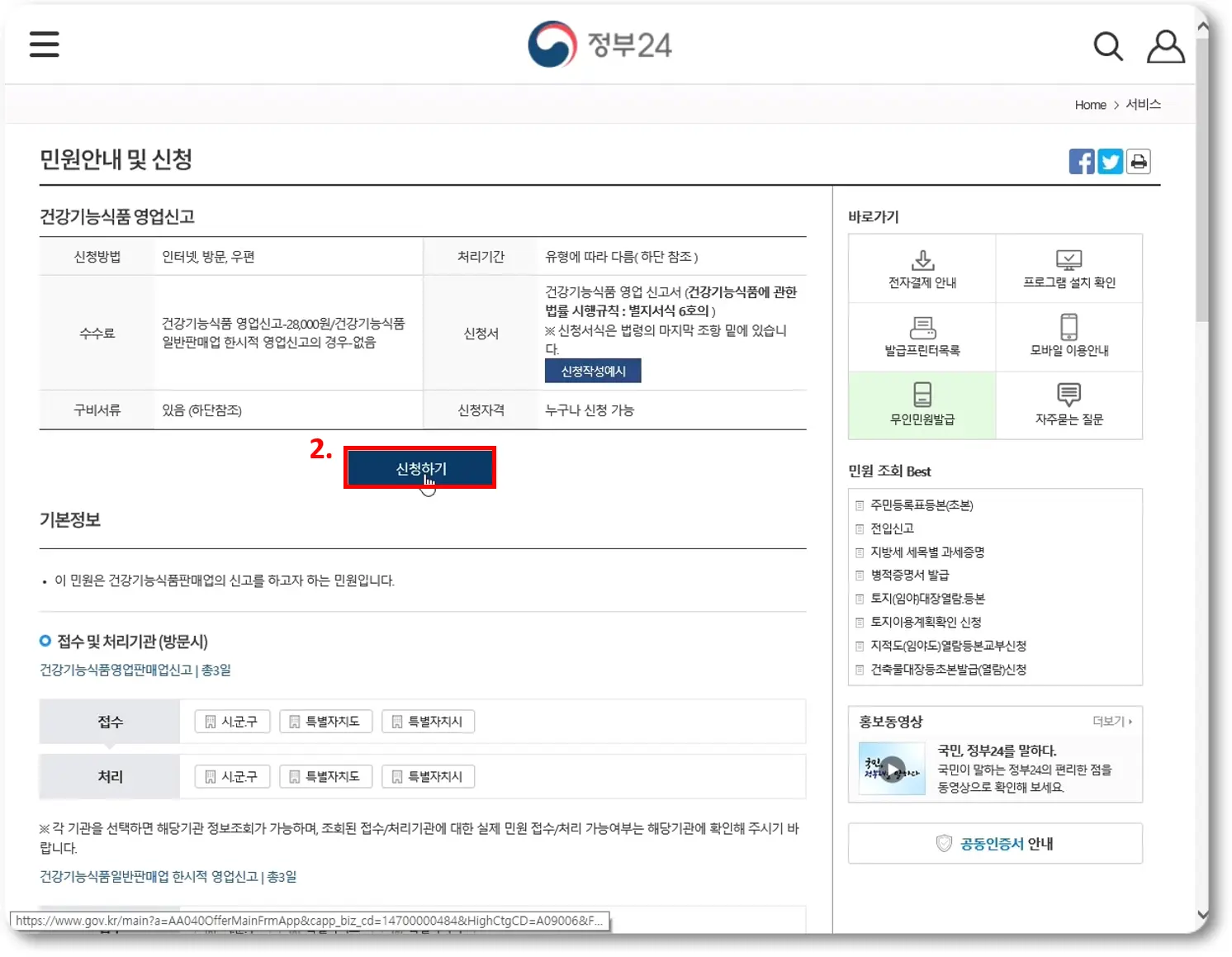 민원 안내 및 신청 결과가 보일 것이고, 바로 그 아래 건강기능식품 영업신고에 대한 내용이 보일 겁니다.