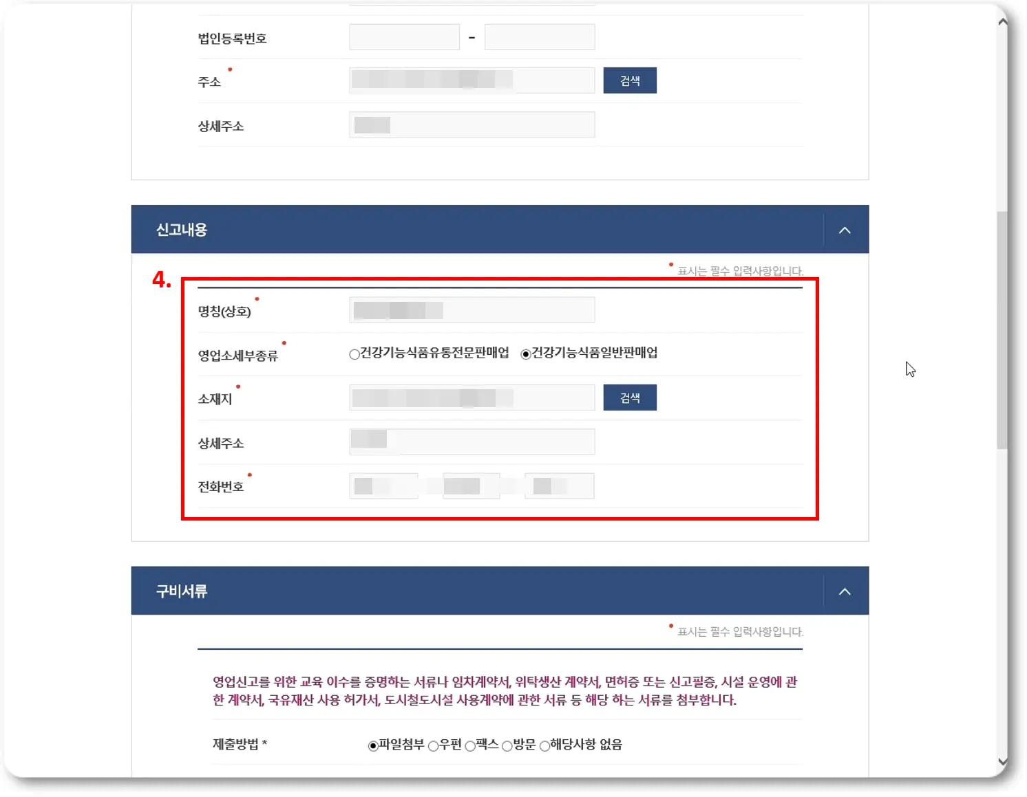 건강기능식품 영업신고 - 신고내용 정보 입력