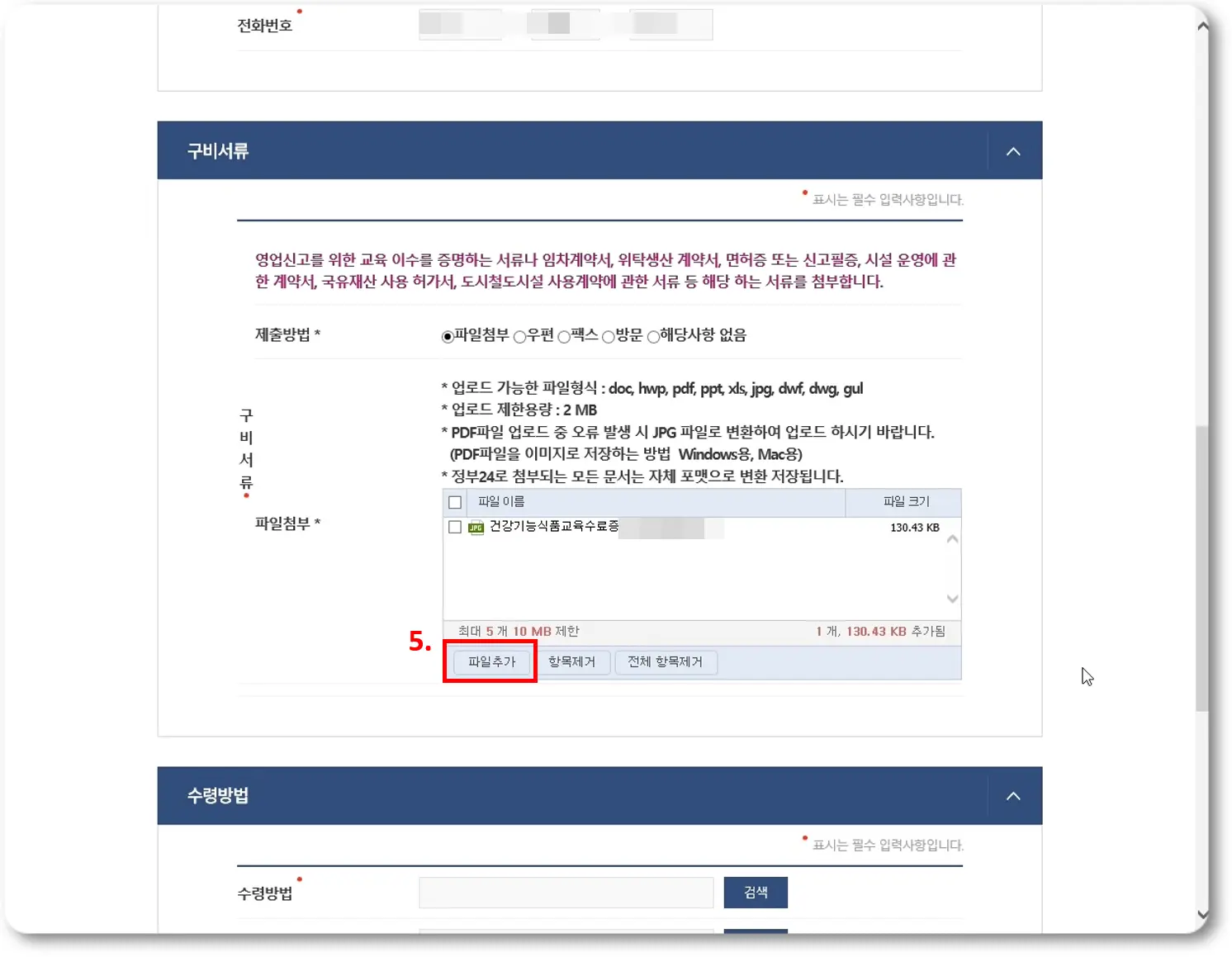 건강기능식품 영업신고 - 수령방법
