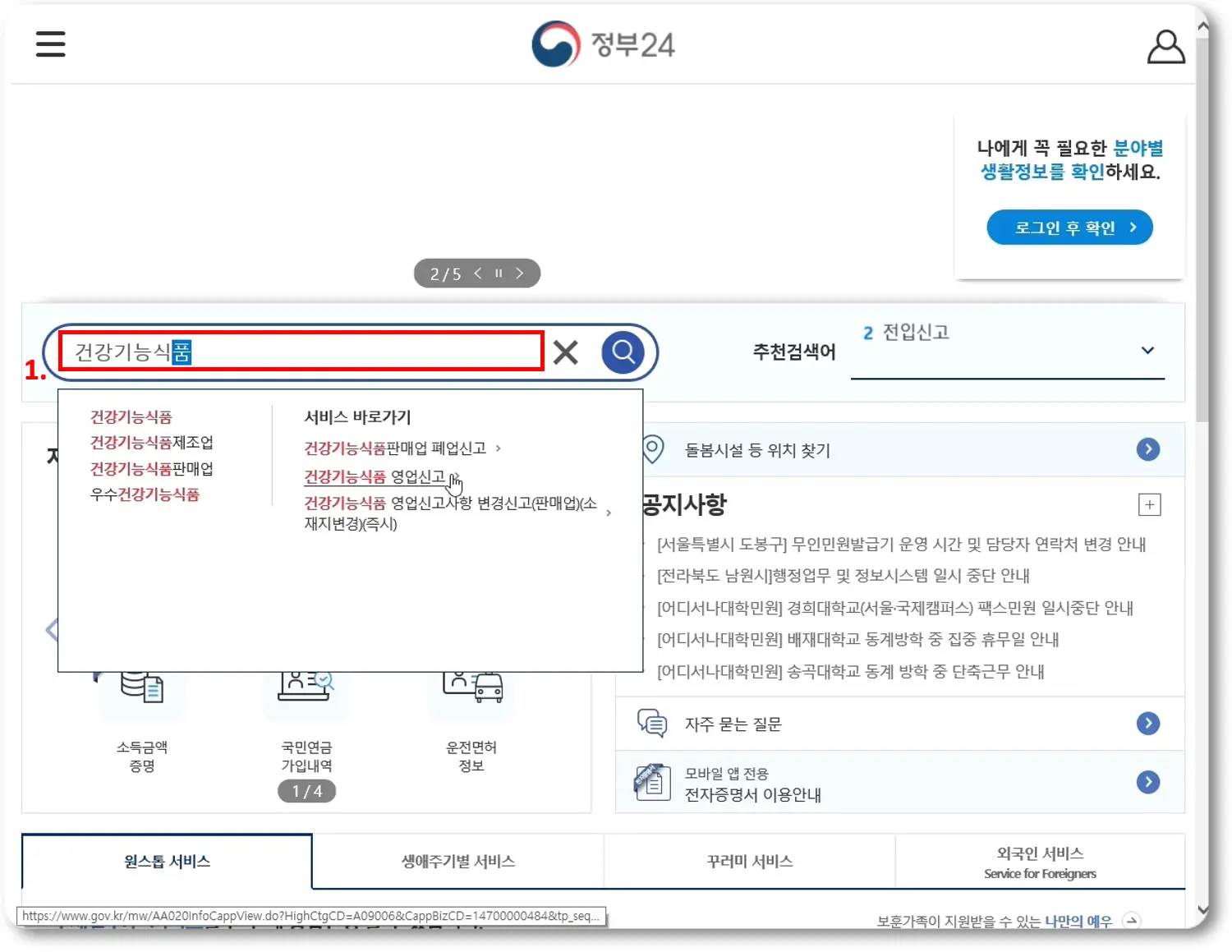메인 화면 좌측 중단에 있는 검색란에서 '건강기능식품'이라고 검색을 해주시면, 검색 결과 중 서비스 바로가기 - 건강기능식품 영엽신고 가 보이실 것이고 이를 클릭해주세요.