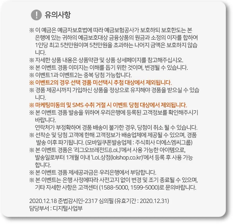 1) 우리은행 앱인 '우리WON뱅킹'을 통해 회원가입을 최초로 하고 난 후 응모하면 LOL 명품상자와 열쇠 1개 세트를 증정하고,