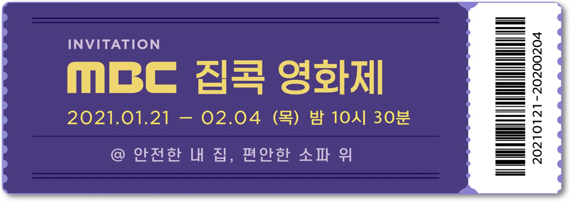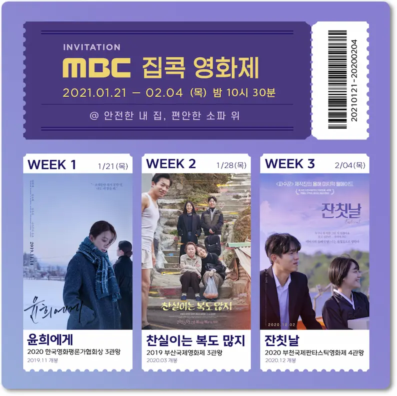 MBC에서 1월 21일 목요일부터 2월 4일 목요일 저녁 10시 30분까지 작품성 높은 우리나라 독립 영화들을 특별 편성하여 '집콕 영화제'라는 이름으로 시청자들에게 선보였습니다.